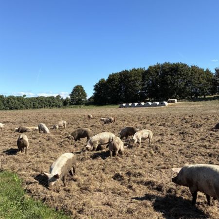 Når vi arbejder med græsgris, vælger vi dyr, der har levet under åben himmel med plads til naturlig adfærd og et liv på græs. Derfor samarbejder vi med Risbjerg Landbrug, et økologisk landbrug med fokus på dyrevelfærd og kvalitet hele vejen fra mark til levering.